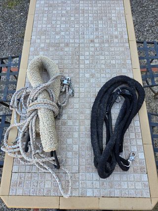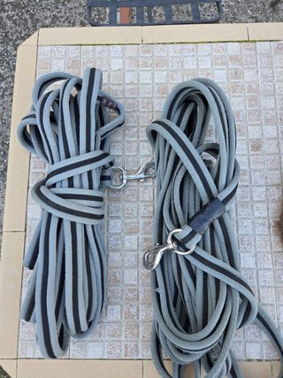 Dos cuerdas largas de entrenamiento para caballos, ideales para el trabajo en pista o para paseos. Marca de Decathlon (8m cada una). Bastante uso. - Cuerdas de color gris con rayas negras. - Incluyen mosquetones metálicos en cada extremo.
