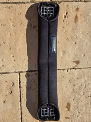 Cinchuelo de dar cuerda de color negro, ideal para entrenamiento equino. Fabricado en material textil resistente. - Marca: Fouganza (Decathlon) - Cinchuelo con múltiples anillas metálicas. - Cierre con hebillas. - Correa ajustable.