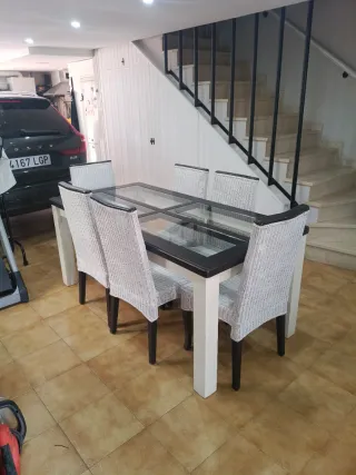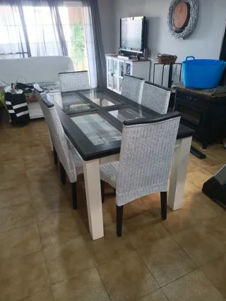 Mesa y 6 Sillas de mimbre de comedor.