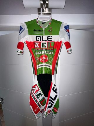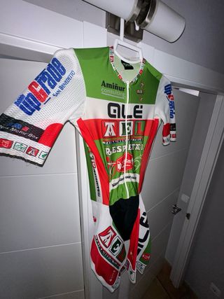 Mono de competición ALE de gran calidad para ciclismo contrarreloj o pista. - Talla S - Solo tiene 1 uso, esta nuevo - Diseño con los colores del Pais Vasco - Logotipos de ALE y otros patrocinadores visibles en la prenda.