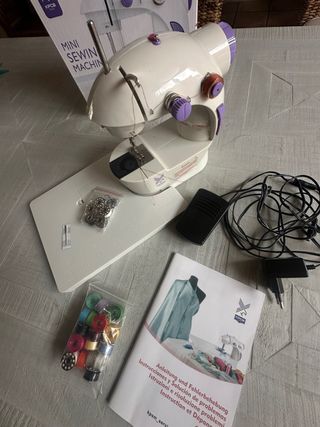 Mini máquina de coser portátil de la marca KPCB, ideal para pequeños arreglos o proyectos. -costó 45€ y Solo tiene 3 usos y desde entonces estaba guardado en su caja - Incluye pedal para un control más preciso. - Viene con un set de bobinas de hilo de colores. - Incluye accesorios adicionales y manual de instrucciones.