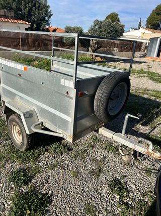 Remolque de coche con estructura metálica y laterales altos. Rueda jockey Basculante - Rueda de repuesto incluida. - Guardabarros en ambas ruedas. - Luces traseras y laterales. Con documentacion Capacidad interior Largo 1,52m Ancho 0,98m Alto 0,56 y 0,91m La lona esta desgastada por el sol