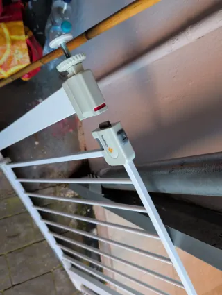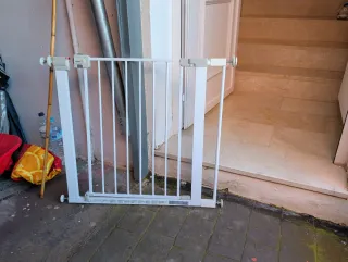 Barrera de seguridad para escaleras, apta para huecos de entre 73 y 87 cm. - Color blanco. - Material metálico.