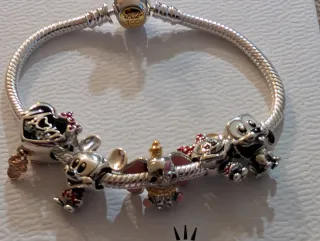 Pulsera de la marca Pandora con temática Disney. - Diseño de eslabones plateados. - Incluye varios charms de personajes Disney. - Cierre seguro.