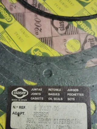 Kit de juntas para diferencial de camiones Pegaso. - Compatible con modelos de 200 y 260 CV. - Incluye juntas y retenes. - Marca Glaser. - Referencia G 30137 00 Producto nuevo y original de época procedente de cierre de taller.