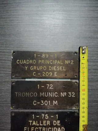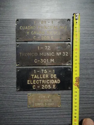 Conjunto de cuatro carteles antiguos de barco de la armada española. El pequeño de latón, los tres más grandes de plástico o pasta similar. - Cartel 1: 1-89-1 CUADRO PRINCIPAL Nº2 Y GRUPO DIESEL C-209 E - Cartel 2: 1-72 TRONCO MUNIC. Nº 32 C-301 M - Cartel 3: 1-75-1 TALLER DE ELECTRICIDAD C-205 E - Cartel 4: 1-75-4 ATMOSFERICO COMPTO. C-304 V
