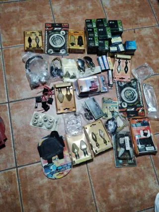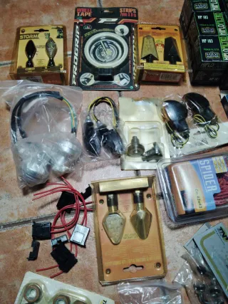 Lote de repuestos nuevos para quad, ciclomotor y scooter. Productos nuevos procedentes de cierre de tienda de recambios. - Incluye cinta reflectante. - Pilotos traseros. - Bujias Bosch. - intermitentes variados. - Otros accesorios.