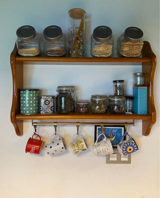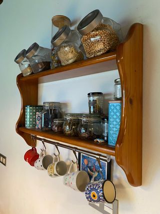 Estantería de pared con un diseño clásico y funcional. Ideal para organizar tus objetos. - Fabricada en madera. - Acabado en color marrón. Una lleva la barra para colgar tazas o lo que quieras y la otra es exactamente igual pero sin la barra.