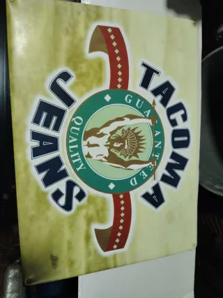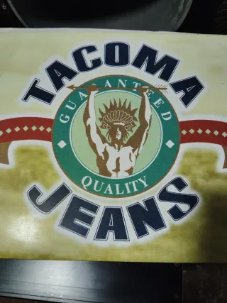 Antiguo artel decorativo de Tacoma Jeans, producto sin estrenar. Parece aluminio 40x30 - Diseño circular con imagen central. - Texto Tacoma Jeans y Quality Guaranteed alrededor. - Colores verde, azul marino y rojo.