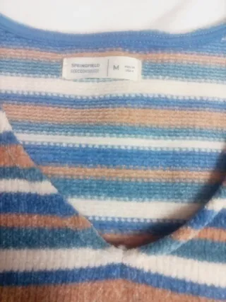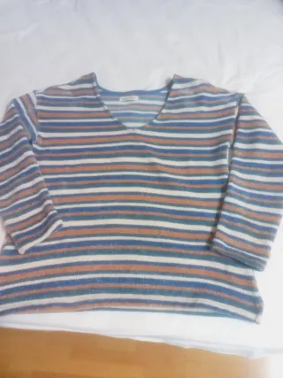 Jersey de mujer con estampado de rayas horizontales. Es una prenda cómoda y versátil. - Diseño de rayas en tonos azules, blancos y anaranjados. - Cuello en pico. Talla M 63 centímetros de largo
