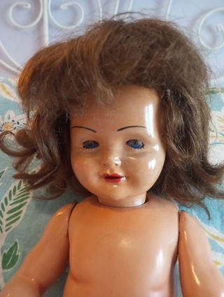 Muñeca Gisela antigua, coetánea a Mariquita Pérez. Ha sido restaurada por Teresa Martín. No tiene craquelado y están ajustadas las articulaciones. Los ojos están fijos (lo único que no se pudo recuperar). La ropa y calzado es el original