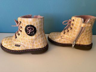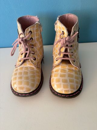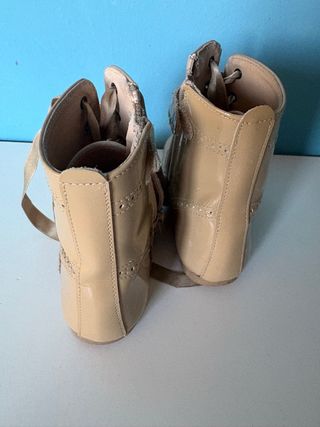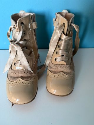 Bonitas botas de charol para niña, talla 26. Perfectas para cualquier ocasión. - Cierre con cordones y cremallera lateral. - Detalle de picado y serraje en la caña. - Lazos de raso. - Suela de goma. PRECIO NO NEGOCIABLE A recoger en Navatejera