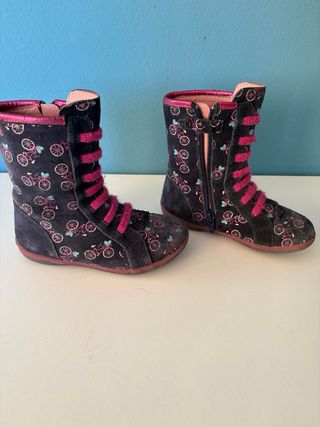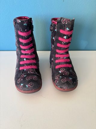 Botas de la marca Agatha Ruiz de la Prada en talla 27. Son de color azul marino con un divertido estampado de bicicletas en rosa y turquesa. - Cierre de cordones rosas. - Detalle de cremallera lateral. - Interior forrado en rosa. Precio no negociable A recoger en Navatejera