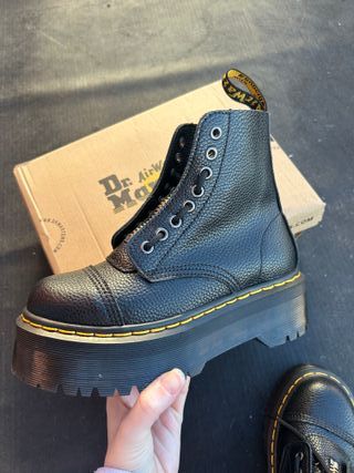 Entrega en mano en León y alrededores. Botas de la marca Dr. Martens con un diseño moderno y atrevido. - Material exterior con textura. - Suela de plataforma gruesa. - Detalle de costuras amarillas. - Lazos y tirador trasero.