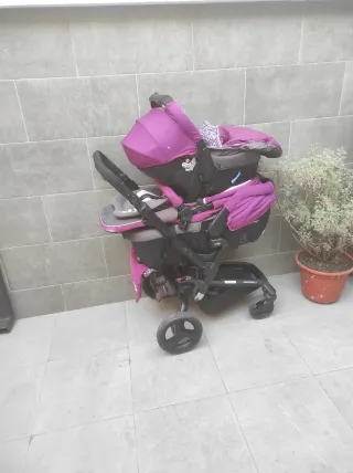 Se vende cochecito de bebé doble en color morado, ideal para hermanos con poca diferencia de edad o gemelos. Incluye silla de coche. - Estructura resistente y segura. - Capazo y silla reversible. - Ruedas todoterreno. - Amplia cesta de almacenamiento.