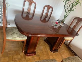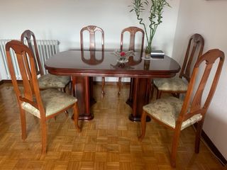 Mesa de madera extensible, con seis sillas de madera y tapizadas en tela Alto: 0,77m Ancho: 0,90m Largo: 1,65m extensible a 2,40m
