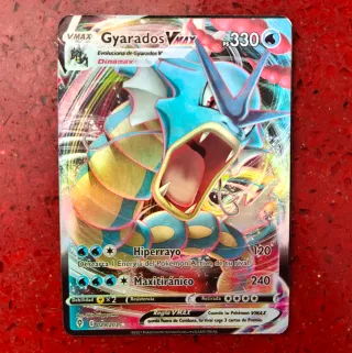 Carta de Pokémon de Gyarados VMAX. - Carta VMAX. - Ataques: Hiperrayo y Maxitiránico. - Ilustración de Shin Nagasawa. - Número de carta: 029/203.