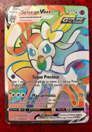 Carta de Pokémon de Sylveon VMAX. - Tipo: VMAX - Número de carta: 211/203 - Ilustrador: Ryota Murayama - Ataque Toque Precioso cura 120 puntos de daño. - Ataque Maxiarmonía hace 30 puntos de daño extra por cada tipo de Pokémon diferente en tu Banca. - Regla VMAX: Cuando tu Pokémon VMAX queda Fuera de Combate, tu rival coge 3 cartas de Premio.