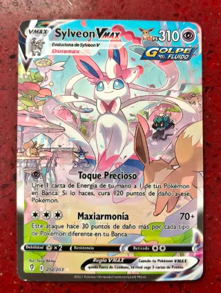 Carta de Pokémon VMAX de Sylveon. - Ilustración de Taira Akitsu. - Número de carta 212/203. - Ataque Toque Precioso cura 120 puntos de daño. - Ataque Maxiarmonía hace 30 puntos de daño extra por cada tipo de Pokémon diferente en tu Banca. - Regla VMAX: Cuando tu Pokémon VMAX queda Fuera de Combate, tu rival coge 3 cartas de Premio.