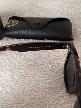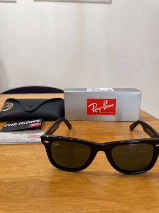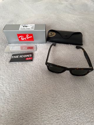 Gafas de sol Ray-Ban modelo Wayfarer con un diseño clásico y atemporal. Incluyen su estuche original. - Montura de tortuga. - Lentes oscuras. - Incluye funda protectora. - Caja original.