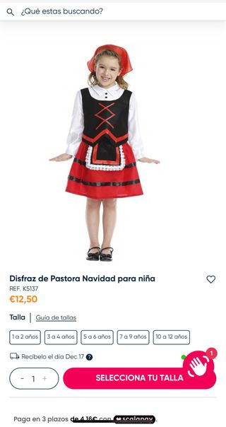 Disfraz de pastora para niña, ideal para Navidad. - Talla 7-9 años - Color: Rojo y negro.