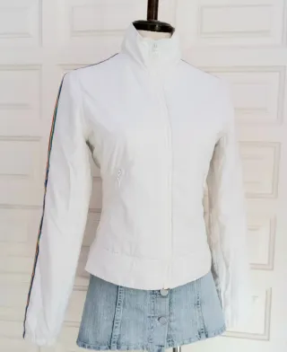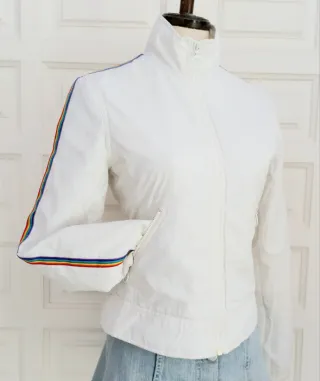Usada, bien conservada. Relleno ligero. Axila a axila 46 cm Largo 55/58 cm Chaqueta estilo vintage con detalles de arcoíris en las mangas. - Diseño de cuello alto. - Cierre de cremallera frontal. - Bolsillos laterales con cremallera.