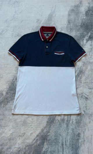 Polo de manga corta de Tommy Hilfiger con un diseño bicolor clásico. Presenta un cuello con detalles de rayas y un bolsillo en el pecho. - Cuello con ribete en contraste. - Bolsillo en el pecho con detalle de ribete. - Cierre de dos botones. Excelente estado, con una pequeña mancha casi inapreciable detrás como se muestra en la foto.