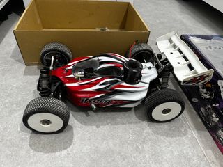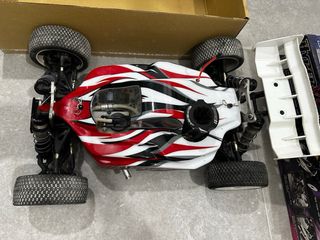 Coche radiocontrol de gasolina, modelo Hyper VS. Presenta un diseño deportivo en colores rojo, blanco y negro. - Carrocería con diseño de llamas. - Neumáticos todoterreno. - Ala trasera. - Motor de combustión. - dos usos solamente