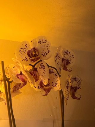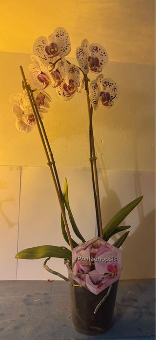 Preciosa orquídea Phalaenopsis con flores blancas y manchas moradas. - Planta en maceta transparente. - Dos varas florales. -súper oferta a 6,50€!!