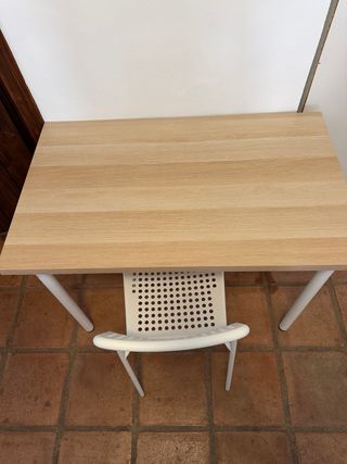 Conjunto de mesa y silla de Ikea con un diseño moderno y funcional. - Tablero de mesa en acabado madera clara. - Estructura de patas en color blanco. - Silla blanca con asiento perforado.