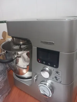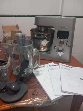 Robot de cocina Kenwood Cooking Chef KCC90 en color plateado. Incluye varios accesorios para amasar, picar, rallar y batir. - Bol de acero inoxidable. - Jarra de cristal. - Manuales de instrucciones.