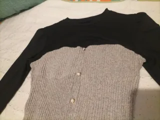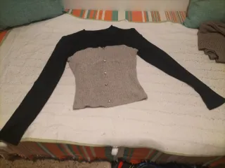 Camiseta de manga larga con un diseño de dos tonos. - Parte superior negra. - Parte inferior gris acanalada. - Cierre de botones nacarados en la parte frontal.