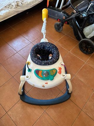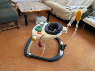 Saltador para bebé con asiento acolchado y estructura resistente. - Asiento con estampado de puntos. - Barra de juego con elementos colgantes. - Altura ajustable.