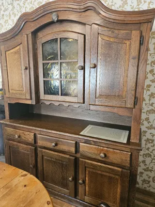Mueble de comedor de madera maciza con un diseño clásico y elegante. Ideal para almacenar vajilla y otros objetos. - Acabado en madera oscura. - Puertas y cajones con tiradores de madera. Usado