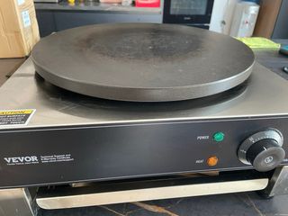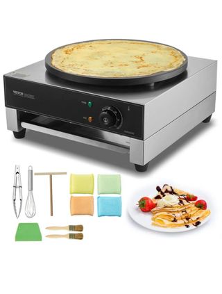 Máquina para hacer crepes de la marca VEVOR con placa plana. Incluye varios accesorios para su uso. - Placa de cocción antiadherente. - Control de temperatura ajustable.