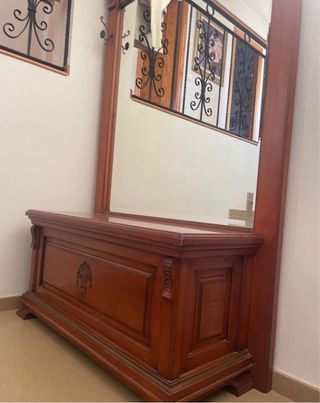 Mueble recibidor madera con espejo y baúl
