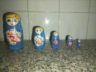 Conjunto de 5 figuras tradicionales rusas,también conocidas como Matrioskas. Son piezas decorativas. - Diseño pintado a mano y en vivos colores. - Apilables unas dentro de otras.