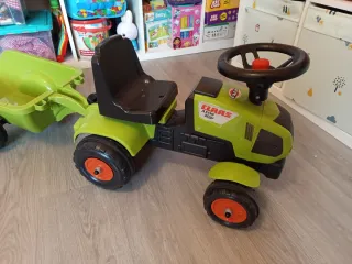 Divertido tractor de juguete de color verde con remolque. A los peques les encanta subirse y transportar cosas.