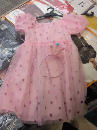 Vestido de princesa en color rosa, ideal para ocasiones especiales. Incluye una diadema a juego. - Tejido de tul con detalles brillantes. - Mangas abullonadas. - Adornado con pequeños corazones. - Diadema con corona y pompón.
