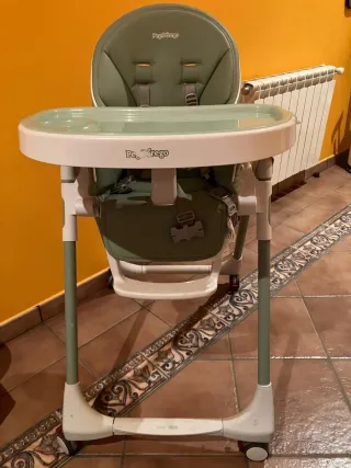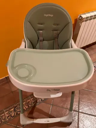 Trona de la marca Peg-Pérego en color verde y blanco. - Asiento acolchado. - Arnés de seguridad. - Bandeja extraíble.