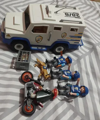 Set de Playmobil 9371, un camión blindado de la policía con figuras y accesorios. - Incluye camión blindado. - Figuras de policías y perro. - Accesorios como caja de dinero y moto.