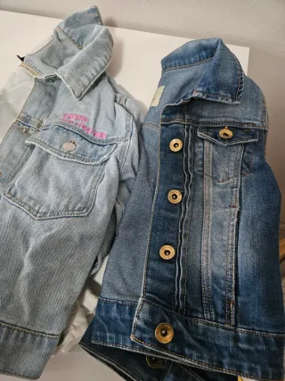 Conjunto de dos chaquetas vaqueras de Zara, talla 4-5 años. - Una chaqueta es blanca. - La otra chaqueta es azul claro con bordado HAVING TOGETHER en rosa.