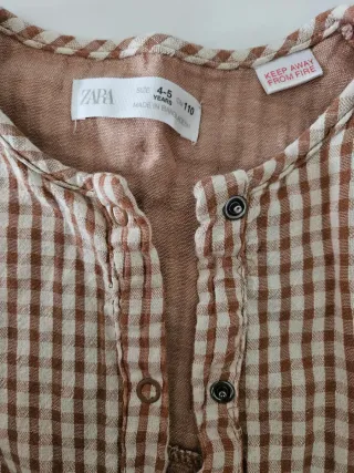 Vestido de Zara con estampado de cuadros en tonos marrones y beige. Ideal para niñas. - Talla 4-5 años. - Manga larga. - Cierre de botones. - Volante en el bajo.