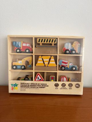 Set de figuras de madera de vehículos y señales de tráfico para jugar y aprender. - Incluye camión, excavadora, hormigonera, barrera, conos y señales. - Fabricado en madera. - Ideal para niños a partir de 18 meses.