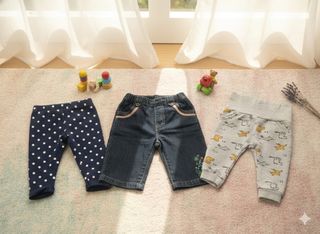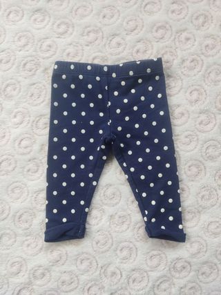 Conjunto de tres pantalones para bebé niña de 6 meses. Poco uso, en perfecto estado. - Legging azul marino con lunares blancos. - Pantalón vaquero con detalles bordados. - Chándal gris con estampado amarillo de animales.