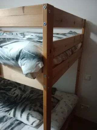 Literas de madera, perfectas para optimizar el espacio en habitaciones infantiles o de invitados. Su diseño sencillo se adapta a cualquier decoración. - Estructura de madera maciza. - Incluye somieres, colchones, sábanas y colchas ( 2 packs )