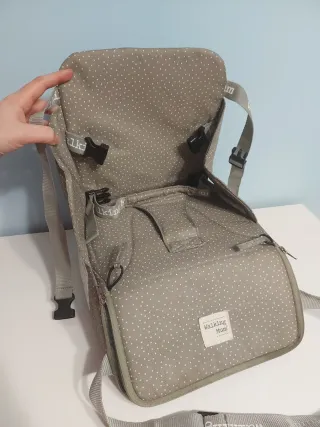 Trona para bebé portatil de la marca Walking Mum, práctico y fácil de llevar. Tiene compartimento con cremallera para guardar sus cosas Diseño con estampado de lunares blancos. Correa ajustable para el asiento y bebé Prácticamente nueva,usada sólo 3 veces