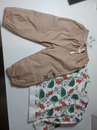 Conjunto de ropa para bebé de 18 meses, compuesto por pantalón y sudadera. - Pantalón color beige con cintura elástica y cordón. - Sudadera blanca con estampado de verduras y árboles.