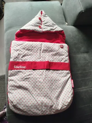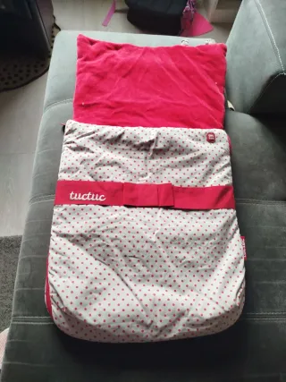 Saco para carrito de bebé de la marca Tuc Tuc. Presenta un diseño alegre con topos rosas sobre fondo claro y un detalle de lazo. - Color: Rojo y blanco. - Diseño: Estampado de topos. - Marca: Tuc Tuc.