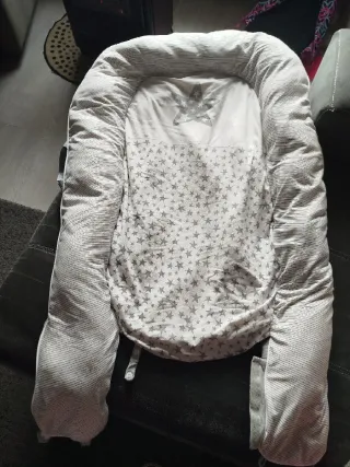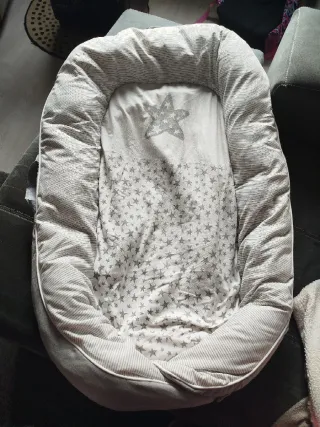 Cojín nido para bebé con un diseño de estrellas grises sobre fondo blanco. El exterior es de rayas grises y blancas. - Diseño de estrellas. - Tejido suave. - Borde acolchado.